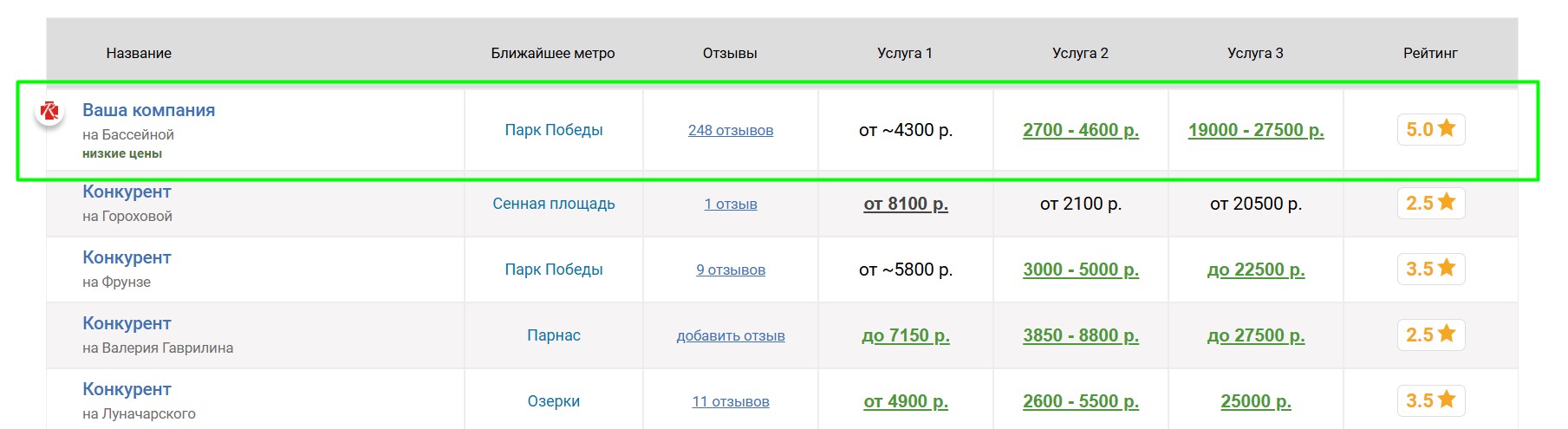 Вокруг продвигаемой таким образом клиники выбирается некоторое количество ближайших конкурирующих клиник, продвигаемая клиника попадёт к ним в таблицу «Сравнение по ценам», которая выглядит следующим образом: